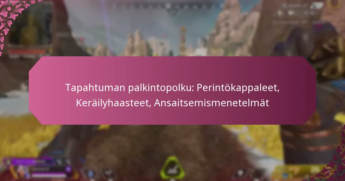 Tapahtumapalkintojärjestelmä Apex Legendsissa palkitsee pelaajia osallistumisesta rajoitettuihin tapahtumiin, joissa on eksklusiivisia esineitä ja perintöpalasia. Pelaajat voivat ansaita näitä arvokkaita palasia suorittamalla pelin sisäisiä haasteita ja osallistumalla kokoelmahaasteisiin, jotka vaativat tiettyjen esineiden keräämistä tai tavoitteiden saavuttamista määräajassa. Tämä järjestelmä parantaa pelielämystä kannustamalla johdonmukaiseen pelaamiseen ja tarjoamalla ainutlaatuisia kosmeettisia avauksia.